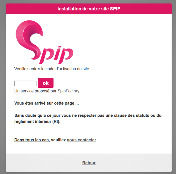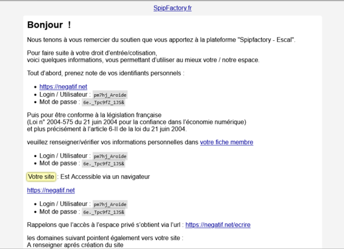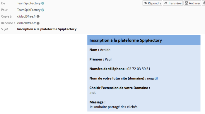 Celui-ci envoie un Courriel sur team@spipfactory.fr sous la forme :