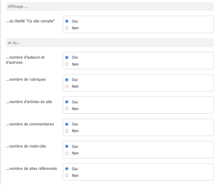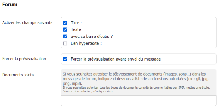 Si vous avez activé le plugin "Liens sociaux", vous pouvez le paramétrer : Afficher les liens sociaux dans la barre d’outils, Afficher les liens sociaux dans le pied de page, un Texte éventuel à afficher