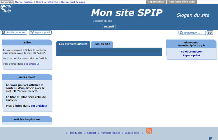 Si vous avez activé le plugin "Mentions légales", vous pouvez faire apparaître le lien vers la page dédiée dans le pied de page du site.