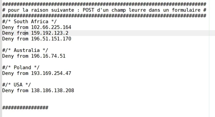Pour bloquer l’ensemble des IPs d’un pays :SetEnvIf GEOIP_COUNTRY_CODE Country_Code BlockCountry Deny from env=BlockCountryExemple : si vous souhaitez bloquer les adresses IPs géolocalisées aux îles Fidji (FJ) et au Groenland (GR), vous devrez écrire l’un des deux codes suivants :