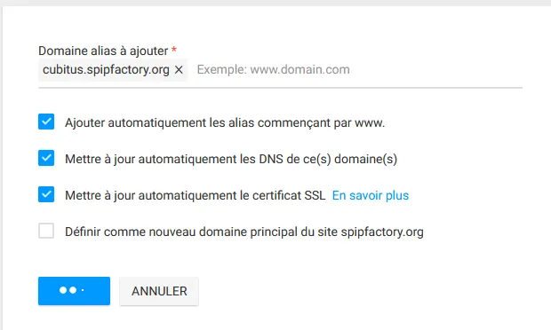 Taper le nom du sous-domaine complet que vous souhaitez- exemple "cubitus.spipfactory.org"