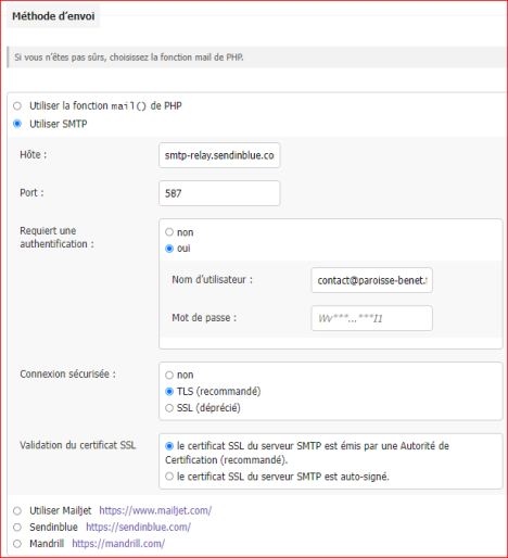 Et reportez dans « Méthode d’envoi » les paramètres relevés chez Sendinblue