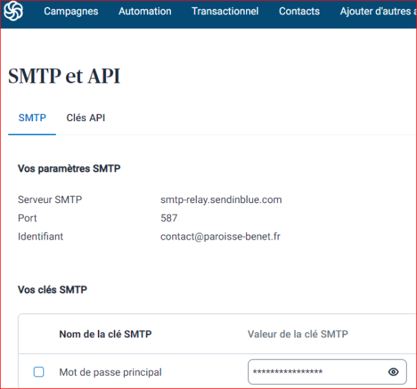 - de relever le nom du serveur SMTP, son port, la clé API, ces infos sont données par sendinblue (voir ci-dessous)