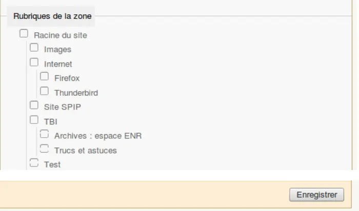 - puis cochez-la ou les rubrique(s) dont vous souhaitez restreindre l’accès,L’ensemble des contenus (articles, sous-rubriques, ...) d’une rubrique sélectionnée sera inclus dans la zone restreinte.