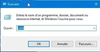 - Ensuite dans la fenêtre exécuter, saisissez cmd puis ok